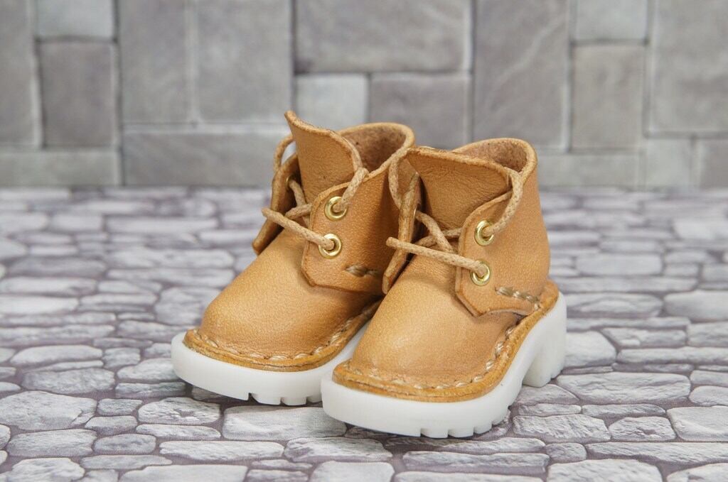 本革:1/6ドールシューズ/ショートブーツ/ベージュ/オビツ24・ブライス・リカちゃん/ブロックパターン靴底